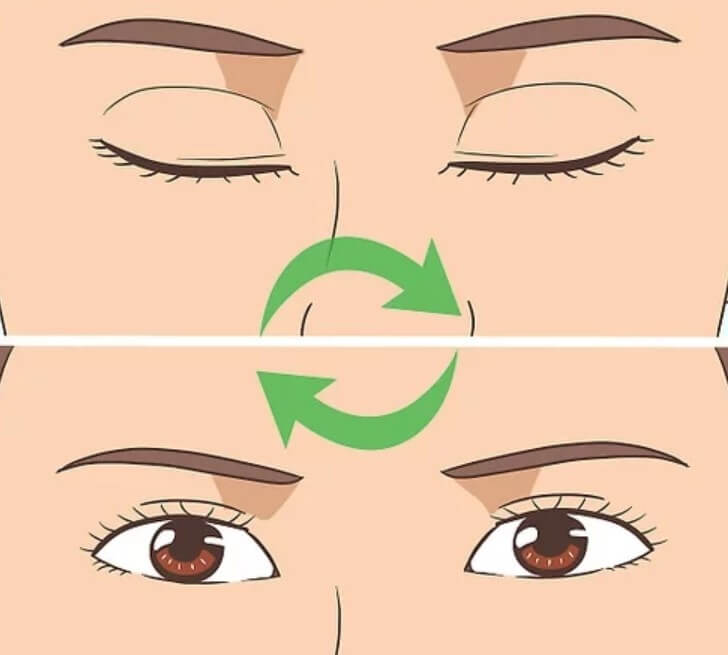 1분 동안 눈을 감습니다. 감은 상태에서 눈을 꽉 감았다가 뜨지 않은 상태로 힘을 풀어줍니다. 3번 반복한 후 눈을 뜨면 됩니다. 이런 운동은 눈물샘을 자극시켜 안구를 촉촉하게 해 주면서 눈 경련에 도움을 줌과 동시에 눈 근육을 발달시키는 효과도 주게 됩니다.