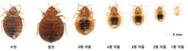 빈대를 눈으로 직접 확인해서 확인할 수 있습니다. 빈대의 성충은 적갈색에 납작하며 5~6㎜ 정도, 약충은 성충에 비해 더 작고 옅은 색깔입니다. 빈대의 모습은 아래의 사진과 같습니다. 참고해 보시는 게 좋습니다.